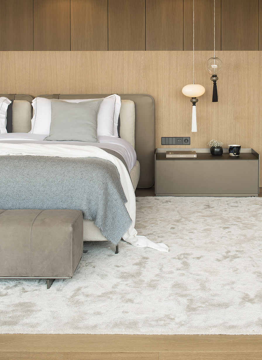 The daytime zone has been decorated in an almost monochrome palette of neutrals featuring many of the same materials and elements to ensure a seamless connection. Carefully composed layers of textures in taupe, cream and silver gray work in harmony with natural wood to make up comfortable and elegant interiors.