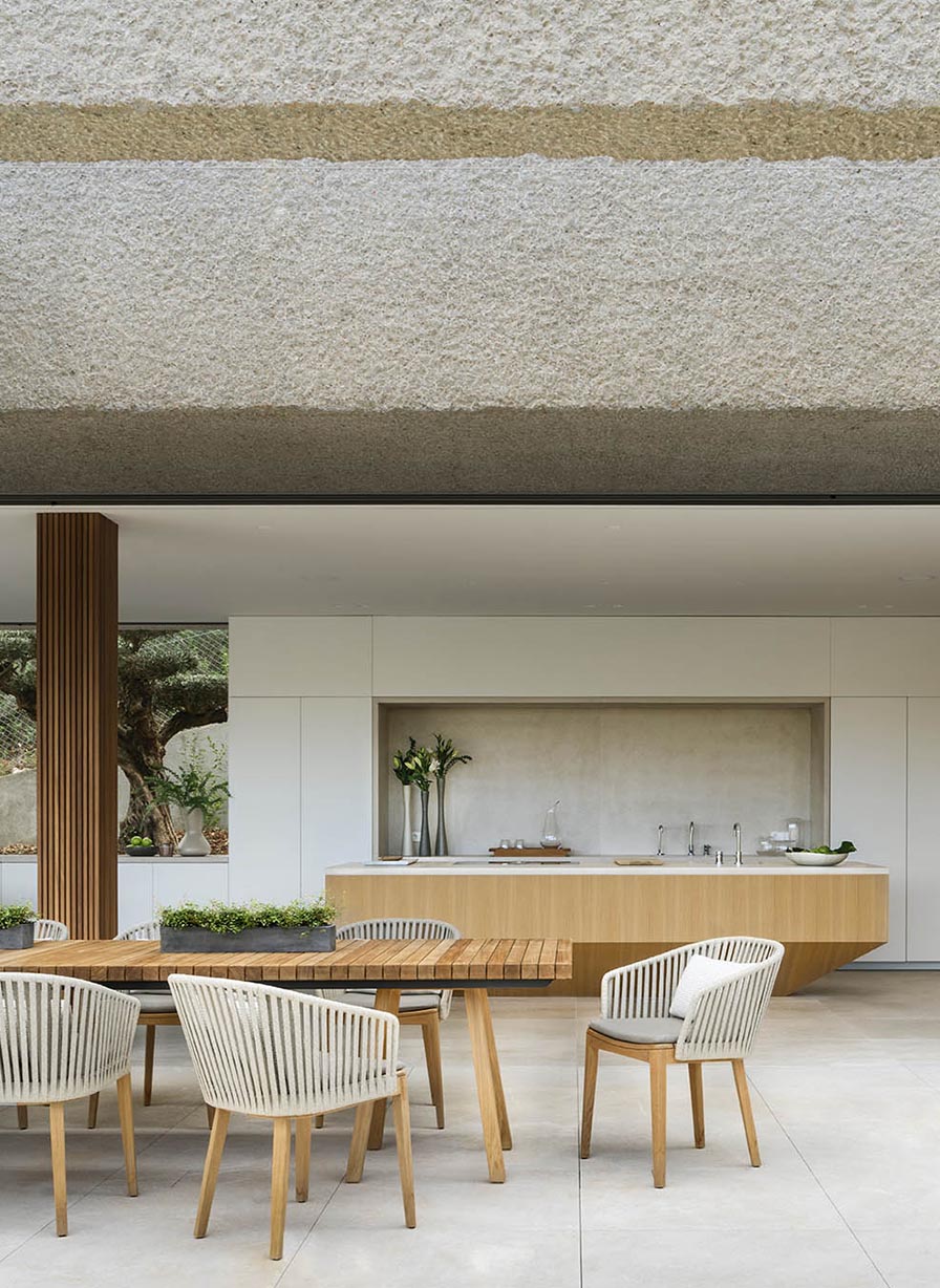 The cohesive storytelling continues outdoors. The covered patio is an oasis filled with greenery, allowing nature to embrace homeowners while enjoying their meal. The furniture here is in harmony with the one on the opposite terrace: soft materials in neutral tones are combined with wood.
